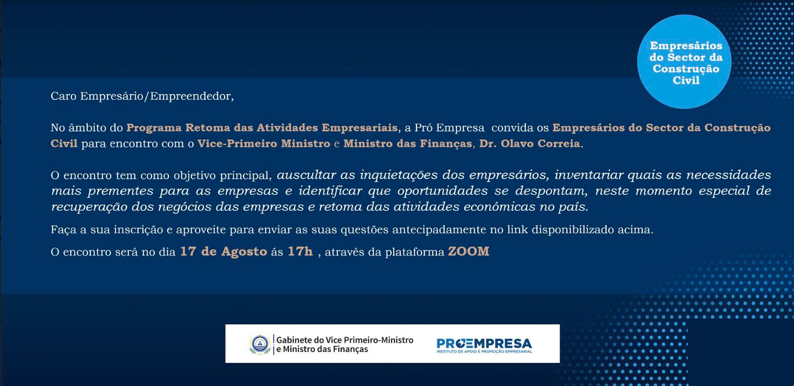 A PRÓ-EMPRESA e o Gabinete do Vice-Primeiro Ministro e Ministro das Finanças convidou a OECV e os seus membros detentores de empresas no ramo da construção civil para um encontro no dia 17 de agosto às 17h00, através da Plataforma Zoom.